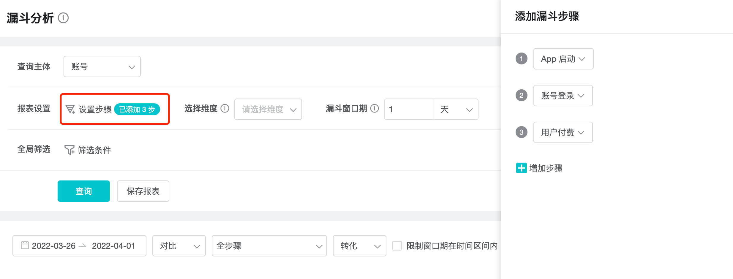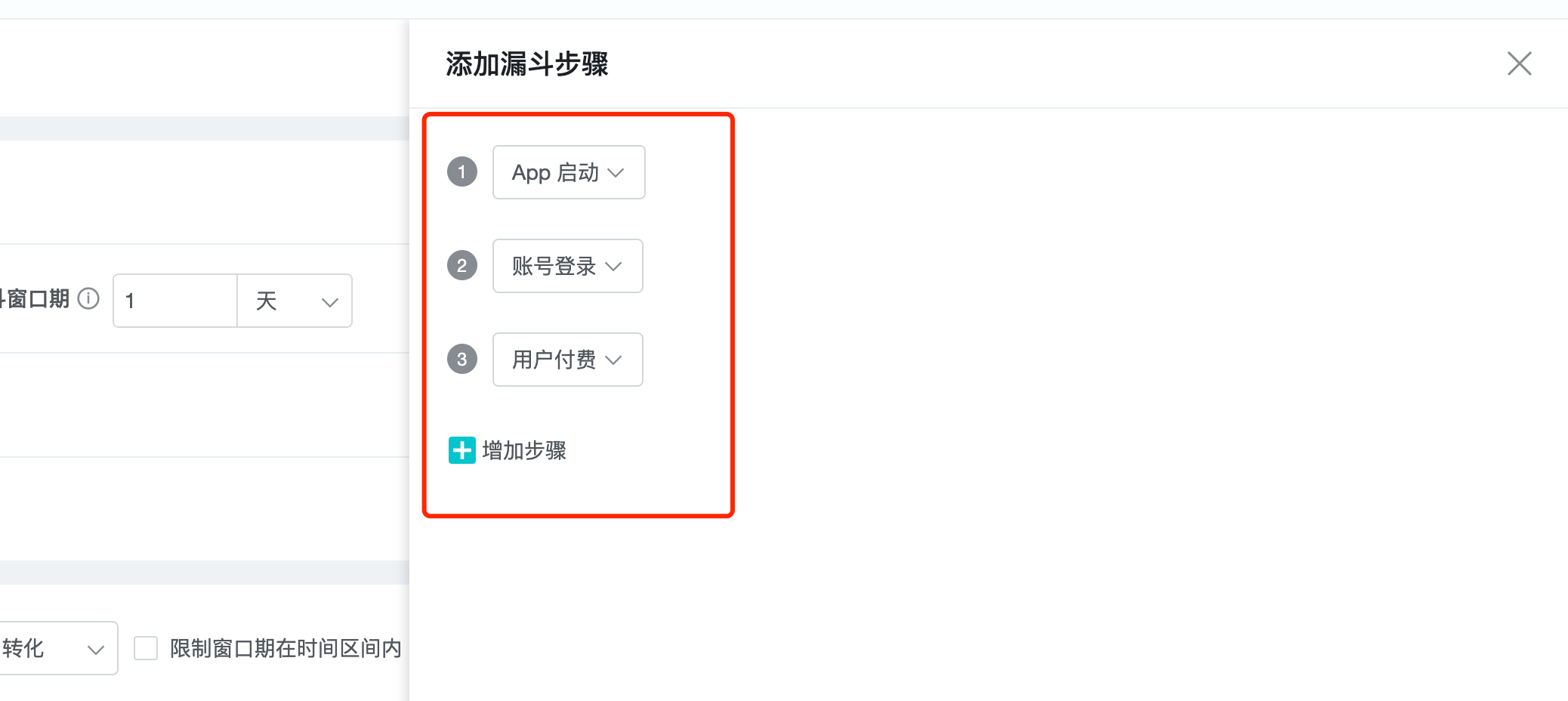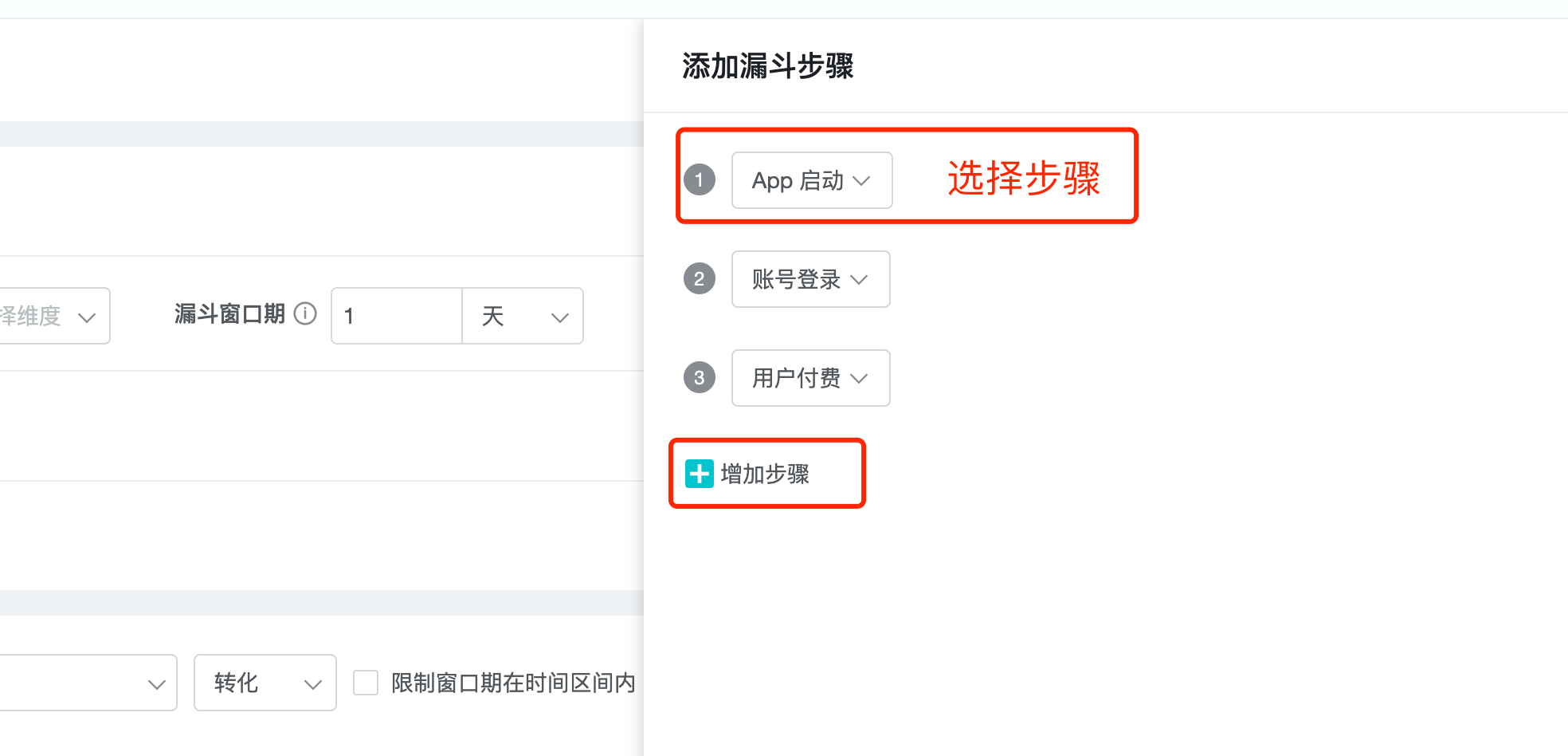 2、Add steps: Add more steps to the funnel to be analyzed.