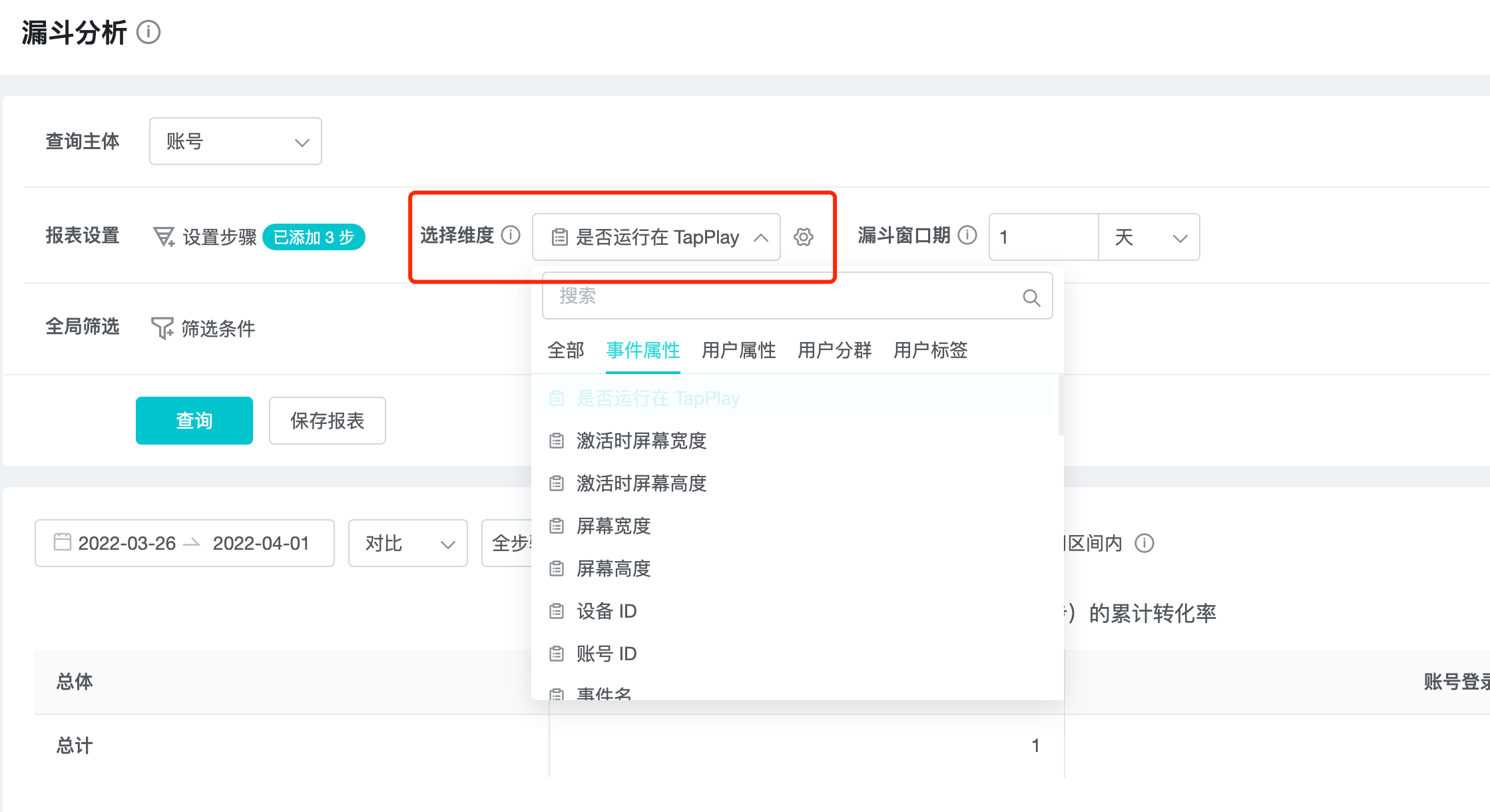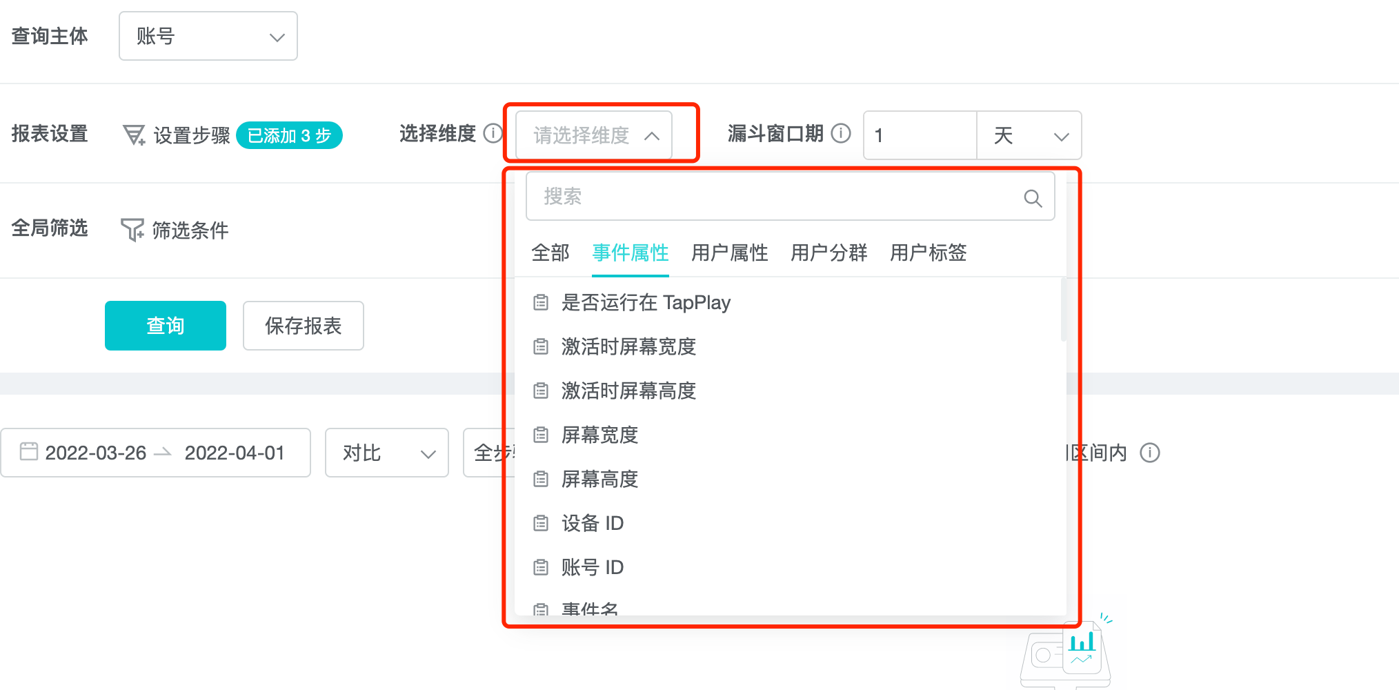 In the dimension drop-down box, the display includes event attributes (Step 1), user attributes, and user subgroups.
