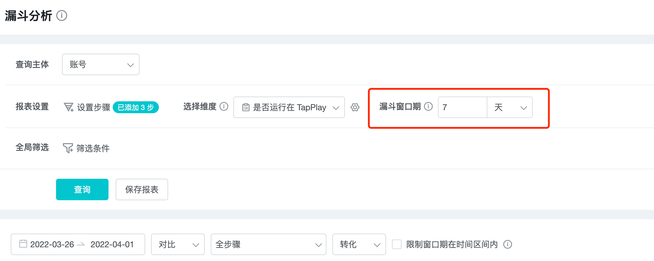 3. Setting the funnel period: we set the funnel period to 7 days.