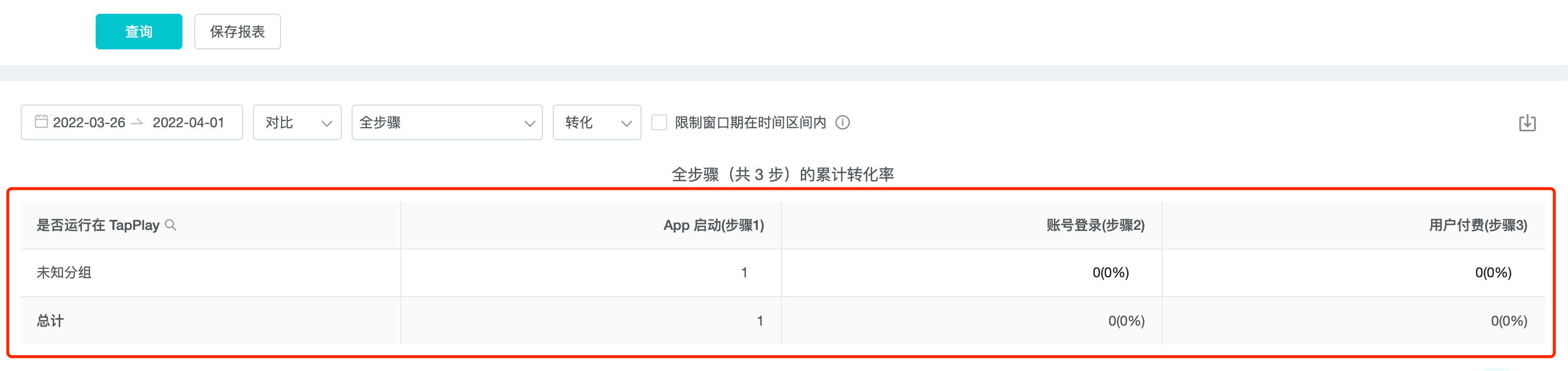 You can select the range of analysis steps, and according to the "Comparison/Trend" and "Conversion/Churn" settings, you can get 4 types of reports: Conversion Comparison Table, Churn Comparison Table, Conversion Trend Table, and Churn Trend Table.