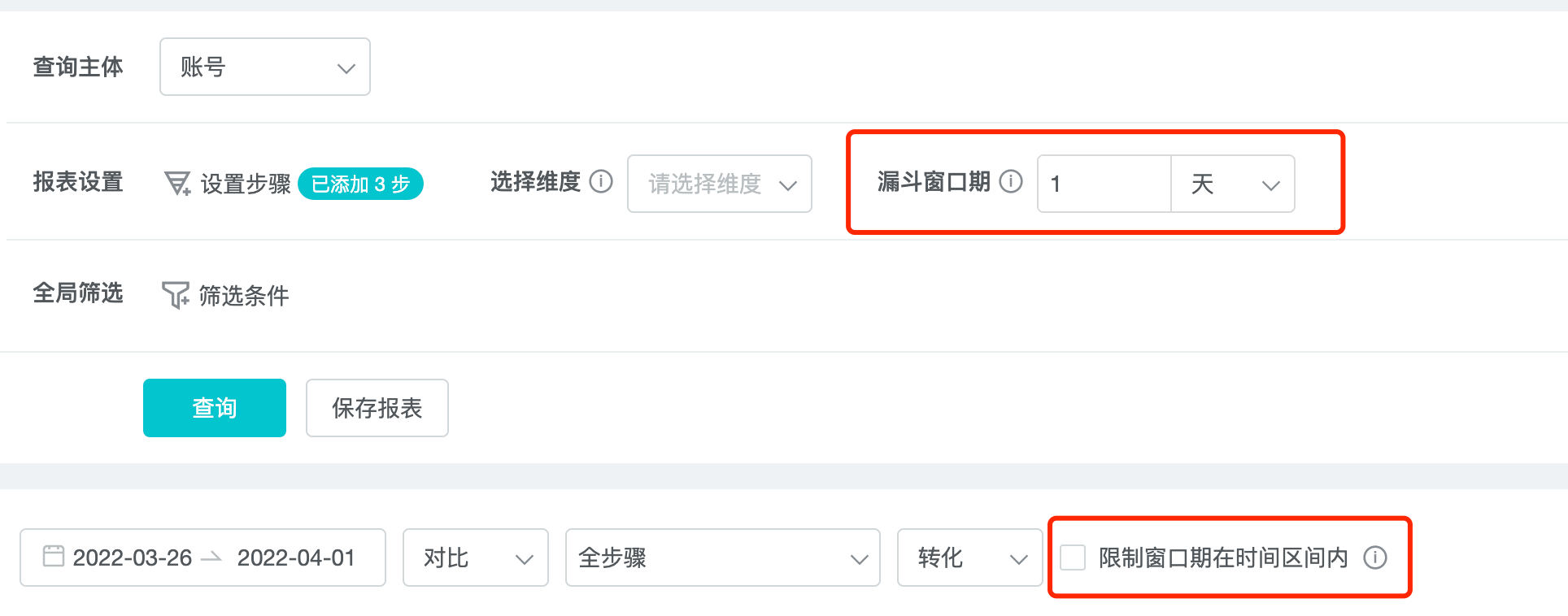 Limiting the window period within the time interval: only within this time frame, the user travels from the first step, to the last step, is considered a complete funnel conversion.