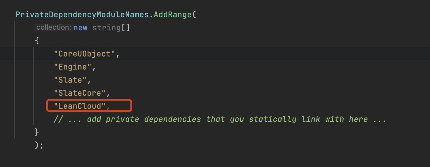 在使用 LeanCloud 功能的 Module 中添加依赖,找到项目当前 Module 的配置文件,即 Module.build.cs 文件。可以在该文件中的 PublicDependencyModuleNames 或者 PrivateDependencyModuleNames 数组中添加 LeanCloud 的依赖