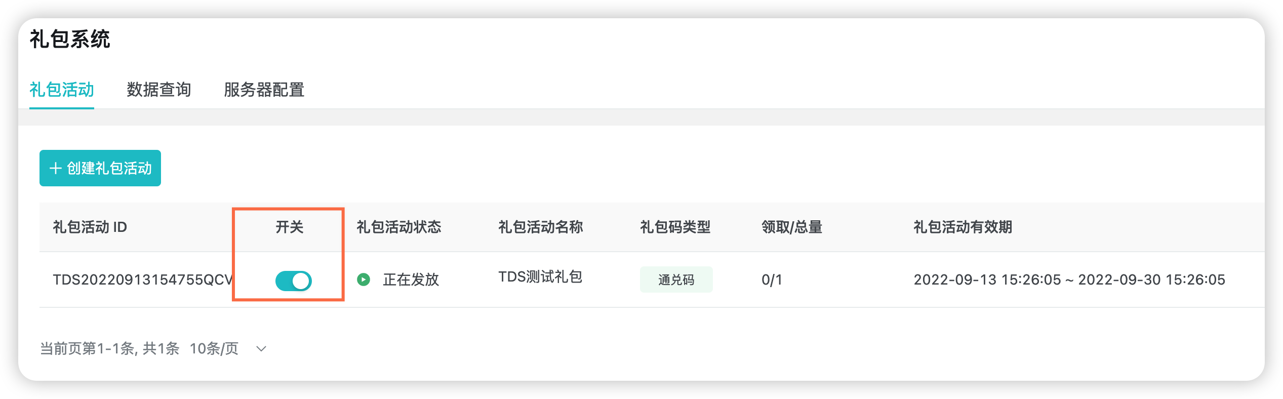 注意:礼包活动上架后礼包码才可被成功兑换,活动上线时务必打开此开关。