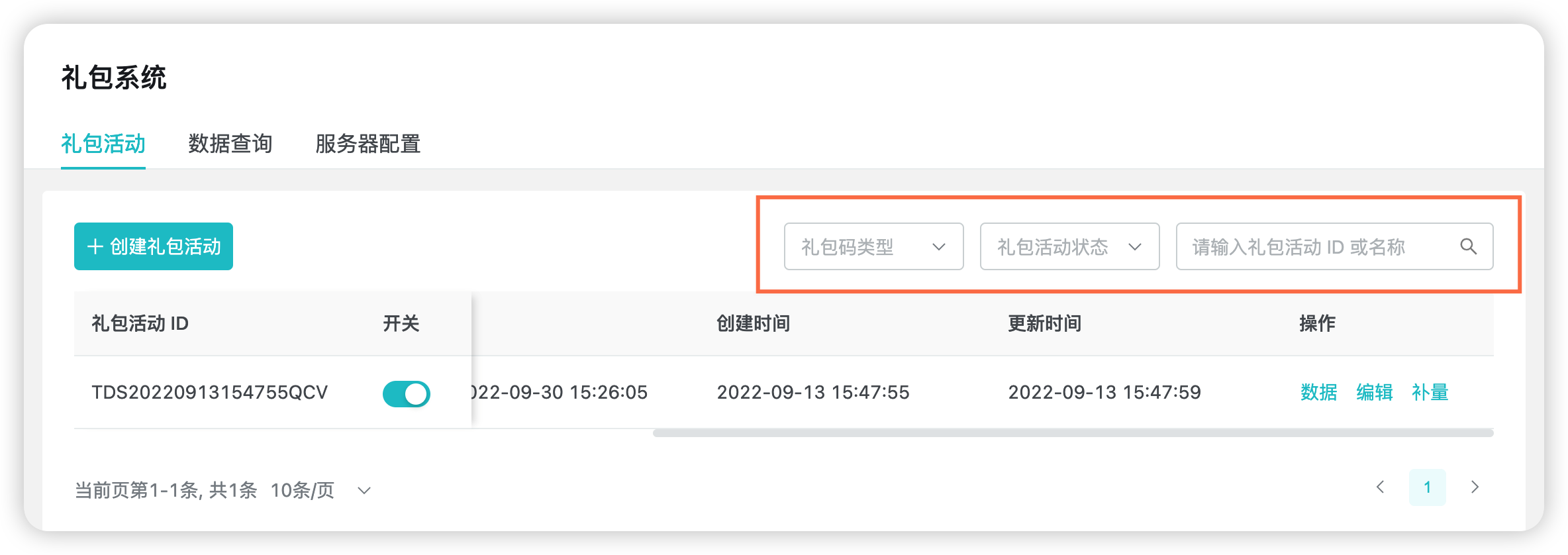 前往 「礼包活动」 列表,点击开关,上架礼包活动使券码生效